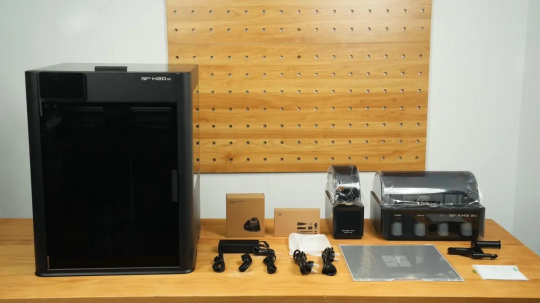 H2D Pro 打印机(已预装打印板)、AMS 2 Pro、AMS HT、料盘支架、料管、急停开关、工具盒、电源适配器、HT 电源线、6-pin 线 *2、电源线 *2、说明书