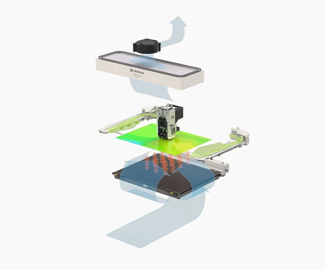 - H型桥式龙门系统,刚性强、共振低,实现微米级打印精度。